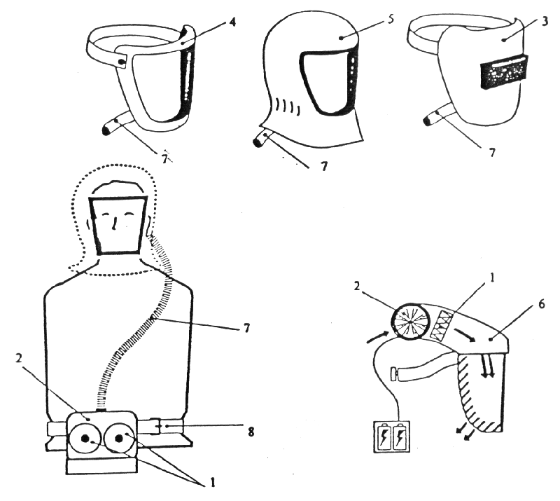1 Element oczyszczający 2. Dmuchawa 3. Przyłbica spawalnicza 4. Osłona twarzy 5. Kaptur 6. Hełm 7. Wąż oddechowy 8. Pas biodrowy lub nośny
