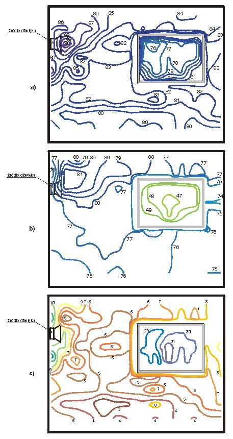 b) - dźwięku A (w dB) w pomieszczeniu badawczym