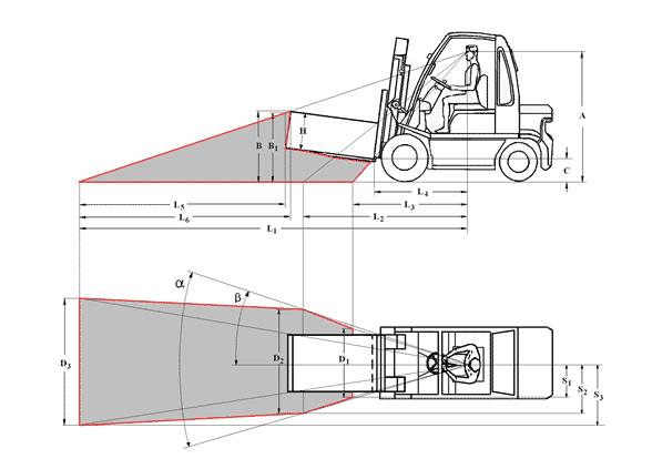 Rys. 1. Wymiary niezbędne do wyznaczenia strefy braku widoczności (strefy martwej) w położeniu wyjściowym podnośnikowego wózka jezdniowego czołowego