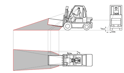 Po opracowaniu uproszczonego modelu podnośnikowego wózka jezdniowego, z zastosowaniem zasad geometrii wykreślnej, można wyznaczyć, przedstawioną na rysunku 5, strefę braku widoczności (strefę martwą) wynikającą z ładunku umieszczonego na wózku, jej główne wymiary oraz kąty widzenia ładunków w płaszczyźnie poziomej.