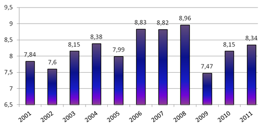Wskaźnik wypadków przy pracy (na 1000 pracujących), podobnie jak liczba wypadków w ciągu ostatnich 10 lat, ulegał niewielkim zmianom nie wykazując wyraźnych tendencji rosnących lub malejących (rys. 2). W roku 2011 wyniósł on 8,34.