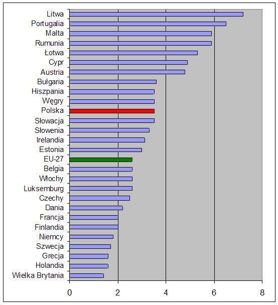 Rys. 1. Standaryzowany wskaźnik śmiertelnych wypadków przy pracy w krajach UE w roku 2005 (wg Eurostatu, http://epp.eurostat.ec.europa.eu)
