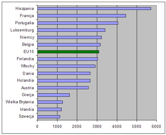 Rys. 2. Standaryzowany wskaźnik wypadków przy pracy powodujących absencję powyżej 3 dni w krajach UE-15 w roku 2005 (wg Eurostatu, http://epp.eurostat.ec.europa.eu)