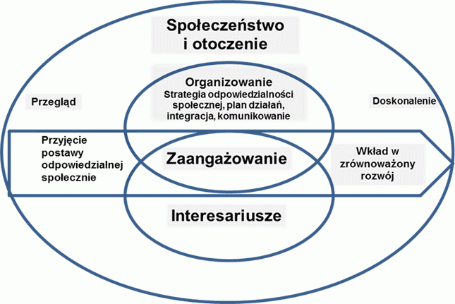 Zasadniczą charakterystyką koncepcji odpowiedzialności społecznej jest gotowość organizacji do przyjęcia i ponoszenia odpowiedzialności za skutki jej działań i decyzji w społeczeństwie i środowisku.