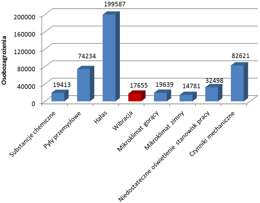 Zaprezentowane w formie graficznej dane statystyczne obrazujące stan zagrożenia drganiami mechanicznymi w środowisku pracy w Polsce opracowano na podstawie danych publikowanych przez Główny Urząd Statystyczny ("Warunki pracy w 2010 r." oraz "Warunki pracy w 2011 r."). Stosowane w opisach osobozagrożenia to suma działających na pracownika, szkodliwych czynników (np. jeśli pracownik narażony jest jednocześnie na drgania mechaniczne, hałas i substancje chemiczne to mamy do czynienia z trzema osobozagrożeniami). Jeżeli na każdego pracownika działa tylko jeden czynnik szkodliwy, wówczas suma osobozagrożeń równa jest liczbie osób narażonych na czynniki szkodliwe.