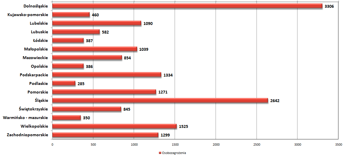 Wykresy na rys. 3 pokazuje liczbę pracowników zagrożonych drganiami mechanicznymi w poszczególnych województwach. Największa liczba zagrożonych tym czynnikiem szkodliwym była w województwach: dolnośląskim (3306 zagrożonych), śląskim (2642) i wielkopolskim (1525), czyli w województwach o znacznej koncentracji zakładów z sekcji przetwórstwa przemysłowego, górnictwa.