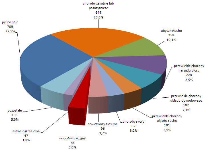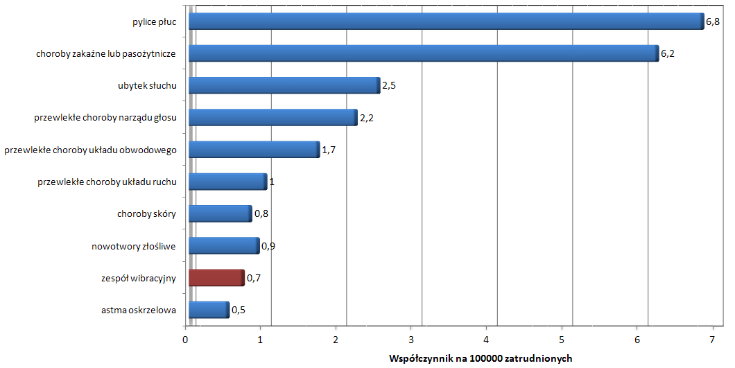 Dane dotyczące chorób zawodowych w Polsce gromadzone są w Centralnym Rejestrze Chorób Zawodowych w Instytucie Medycyny Pracy im. prof. J. Nofera w Łodzi. Na wykresach z rys. 5 i rys. 6 opracowanych na podstawie danych opublikowanych przez IMP pokazano liczbę przypadków stwierdzonych w Polsce w 2011 r. chorób zawodowych w liczbach bezwzględnych i w przeliczeniu na 100 tys. pracujących (tzw. współczynnik zachorowalności). Prezentowane dane ograniczono do chorób o największej zapadalności. Dane dla zespołu wibracyjnego zaznaczono pomarańczowym. Z przedstawionych danych wynika, że w 2011 r. stwierdzono 78 przypadków zespołu wibracyjnego co odpowiadało współczynnikowi zachorowalności równemu 0,7.