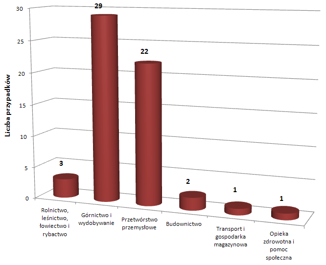 Na Rys. 7 przedstawiono dane dotyczące stwierdzonych przypadków zespołu wibracyjnego w 2010 r. w poszczególnych sekcjach gospodarki narodowej. Najwięcej przypadków tej choroby stwierdza się w sekcjach górnictwa i wydobywania (29 przypadków), przetwórstwa przemysłowego (22), rolnictwa, leśnictwa, łowiectwa i rybactwa (9) oraz budownictwa (2). Są to sekcje, w których powszechnie wykorzystywane są różnego rodzaju pneumatyczne, hydrauliczne, elektryczne i spalinowe narzędzia ręczne takie jak młoty pneumatyczne, wiertarki (w tym udarowe), szlifierki, ubijaki udarowe i piły łańcuchowe.