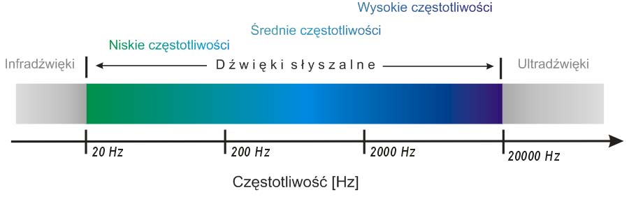 Ucho ludzkie jest w stanie odbierać dźwięki o częstotliwościach od 20 Hz do 20 kHz (1 kHz = 1000 Hz). Dźwięki takie nazywamy dźwiękami słyszalnymi. Niesłyszalne dla człowieka dźwięki o częstotliwościach poniżej 20 Hz nazywamy infradźwiękami a dźwięki o częstotliwościach powyżej 20 kHz nazywamy ultradźwiękami (Rys. 2). Używając pojęcia "hałas" mamy na myśli dźwięki słyszalne (obok pojęcia "hałas" funkcjonują również pojęcia "hałasu infradźwiękowego" i "hałasu ultradźwiękowego").