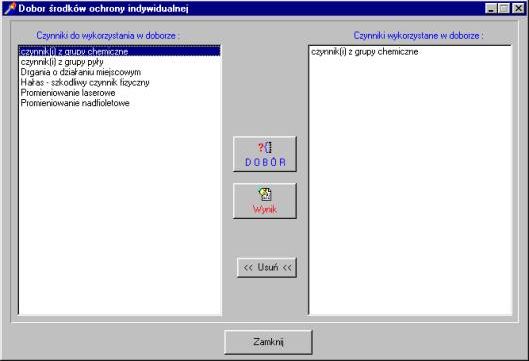 Wykonywanie procedur doboru środków ochrony indywidualnej odpowiednich do ochrony przed zagrożeniami związanymi z poszczególnymi czynnikami szkodliwymi, wymaga wprowadzania szeregu odpowiedzi na zadawane przez moduł kolejne pytania. Wprowadzanie powyższych danych może polegać na wyborze stosownych elementów z zaproponowanych list wyboru, zaznaczaniu wybranego przycisku lub wprowadzaniu odpowiednich wartości w polach edycyjnych.