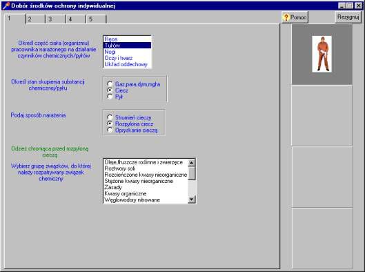 Na rysunku poniżej przedstawiono przykładowy formularz dotyczący doboru środków ochrony indywidualnej w tym przypadku - dla czynnika chemicznego.Proces doboru może być kontynuowany na kolejnych zakładkach lub dodatkowych podformularzach, udostępnianych przez formularz procedury doboru. W momencie jej zakończenia kolor wszystkich napisów zmienia się na niebieski, co oznacza, że we wprowadzonych danych nie można już dokonywać zmian. Kolorem czarnym zaznaczony jest tekst pytań oraz zakres procesu doboru, który jeszcze może podlegać modyfikacjom. Kolorem zielonym zaznaczone są wybrane elementy lub grupy środków ochrony indywidualnej.
