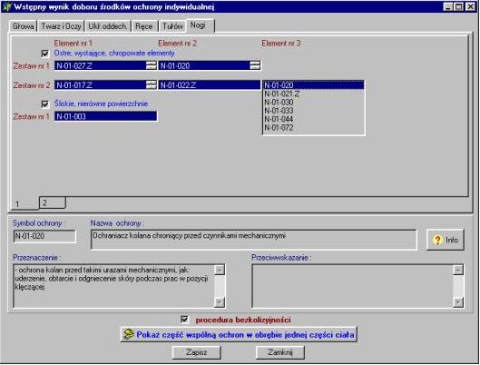 Wstępnym wynikiem procedury doboru jest wybrany zestaw środków ochrony indywidualnej, podlegający dalszej obróbce w kolejnych etapach procedury doboru. Na rysunku poniżej przedstawiono przykładowo formularz, zawierający podgląd symboli wstępnie dobranych środków ochrony indywidualnej wraz z ich krótką charakterystyką. Więcej szczegółów można uzyskać po naciśnięciu przycisku Info i skorzystaniu z danych zawartych w informatorze INFOCHRON. Przy każdej liście środków ochrony indywidualnej, przedstawionej na ww. formularzu znajduje się znacznik decydujący, czy dane środki ochrony będą rozpatrywane w procesie doboru ostatecznego po naciśnięciu przycisku Pokaż część wspólną ochron w obrębie jednej części ciała. Znaczniki te (jeżeli są zaznaczone) w przypadku otrzymania niezadowalających wyników doboru lub nieotrzymania ich wcale, można odznaczać, a następnie przeprowadzać procedurę doboru ostatecznego ponownie.